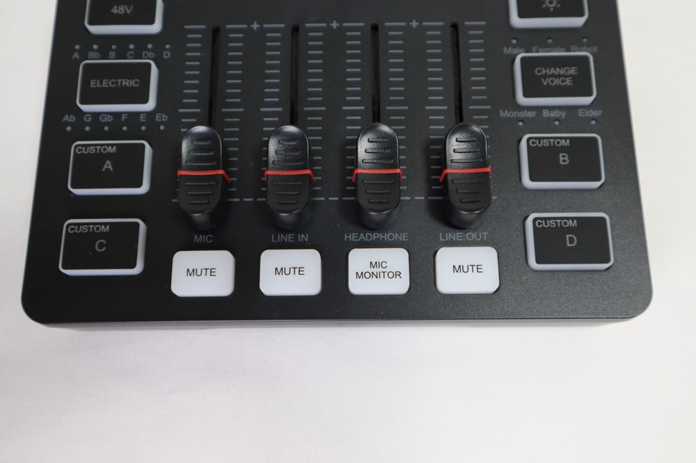 特に中央のノブは大きめで操作性に優れ、配信中などでも音量をスムーズに調整できます。