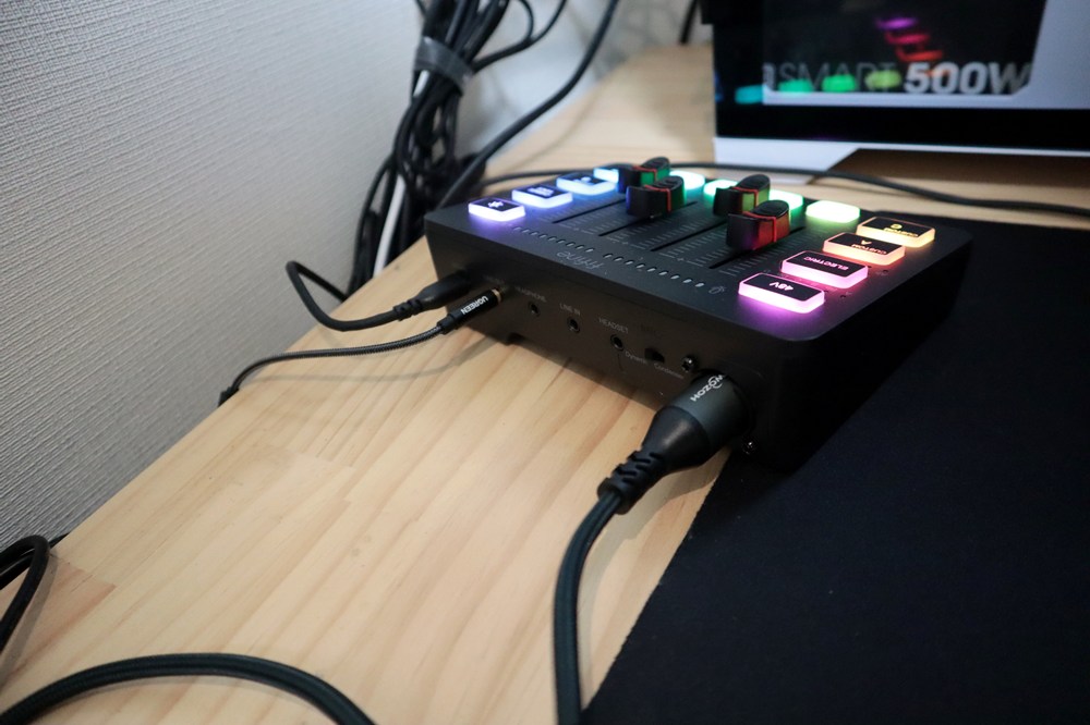 本体中央のノブ周辺にはRGBライティングが施されており、ゲーミングデバイス感がかなりあるオーディオミキサーです。