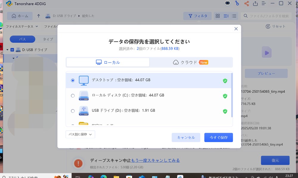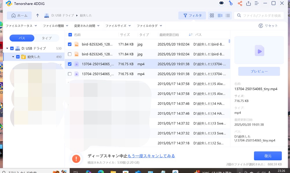 完全に削除してしまったファイルでも、プレビュー付きで復元可能なものを確認し、必要に応じて復元まで行えるのは非常に心強いポイントです。
